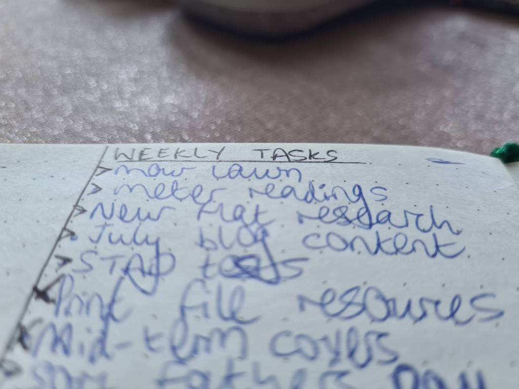 Another task that I save for the week’s end is assessing the weekly column itself. If I’ve not ticked off a task, I question why haven’t I done this? and either remove the task or carry it over to the following week.