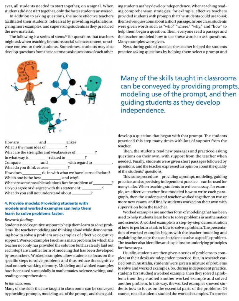 Get your students to practice small amounts of new material, and help them with their practice. Giving them too much new information will swamp their working memory, and they might struggle to acquire anything else. Rosenshine actually found that the most effective teachers spent over half of a 40-minute lesson on presenting new material and providing more explanations.