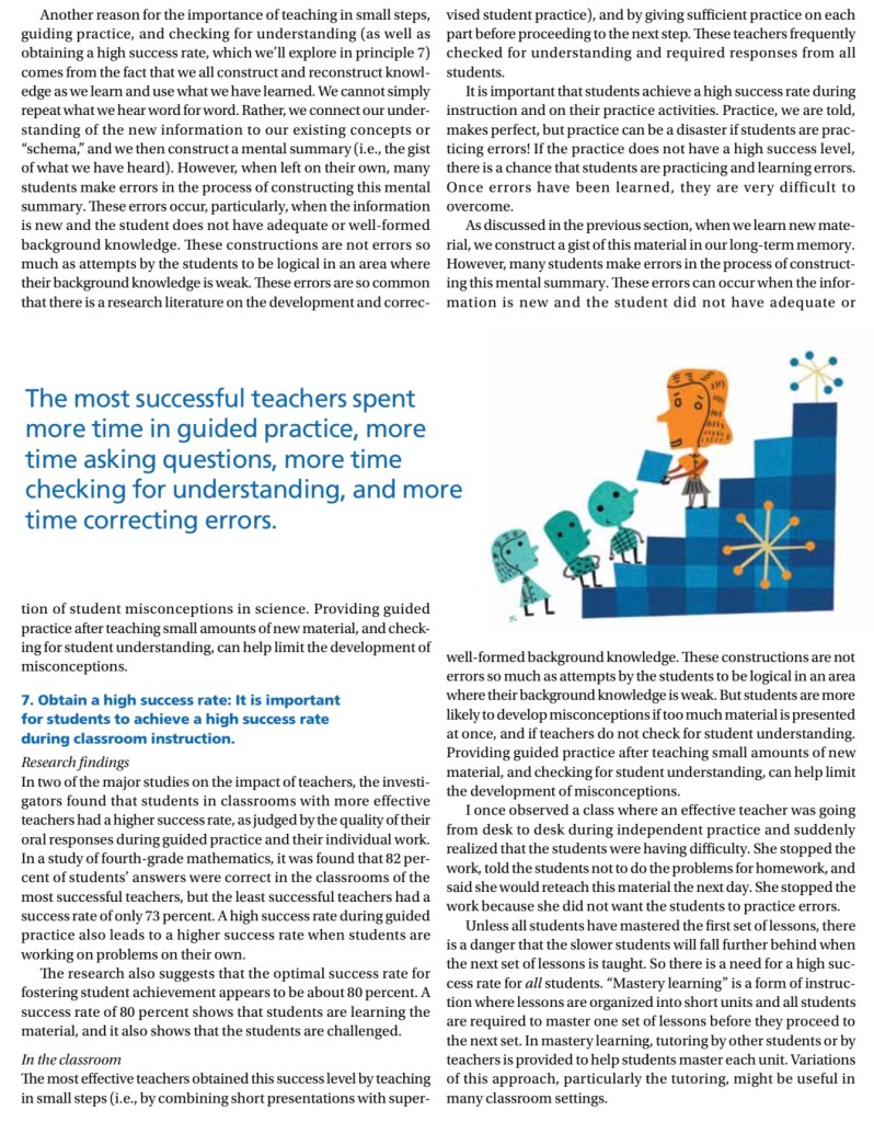 Rosenshine makes really clear that any newly acquired skills should be practiced far beyond the point of initial mastery. Practice makes perfect.