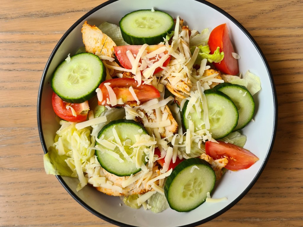 OPTION 2: Lettuce, cucumber, a whole tomato, chicken slices, cheese and salad cream. 399kcal, 21.5g carbs, 20g fat, 32.8g protein.