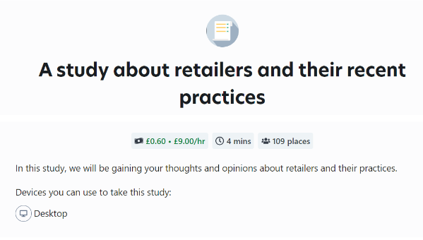 - The most important part: how much you’ll make is attached to every study. I’ve already made £1.10 while writing this blog post (we’re currently 20 minutes into the writing process) and it took me all of 6 or 7 minutes. You can decide whether you’re prepared to spend longer on the platform for the studies that’ll make you wealthier, or if you’d rather log on for a couple of minutes at a time, get a little extra cash, and be done with it. I usually prefer the latter – short, sharp, snappy studies – but I literally just completed another that took all of 1 minute, earned me 45p, and was valued at earning £15.14/hour. Wild.