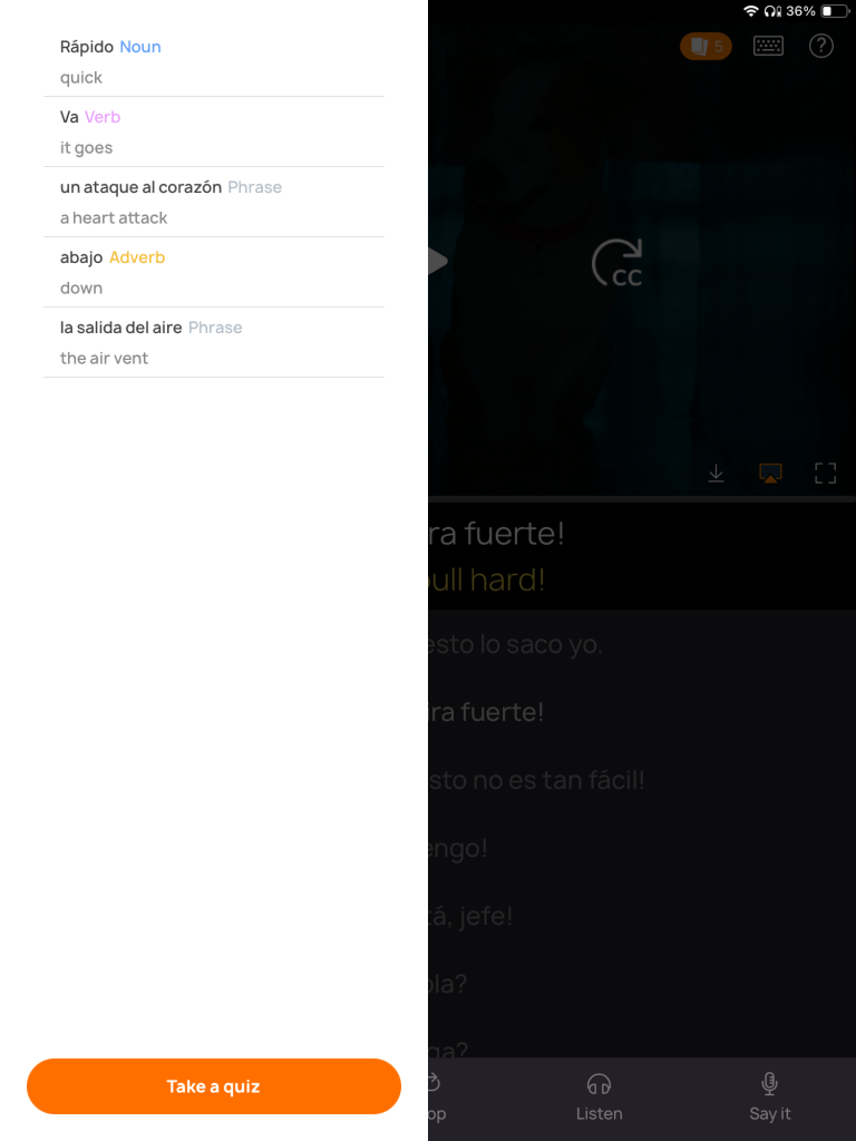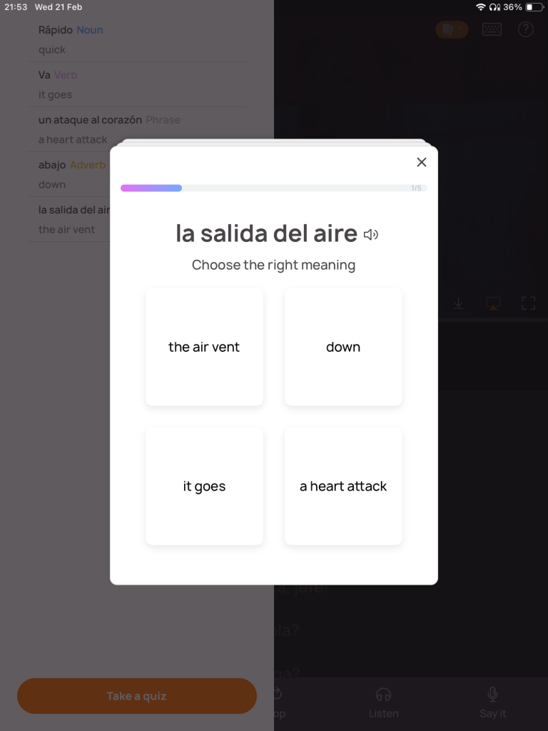 If you want to go over any words in your TV show again, you can scroll through the transcript, tap the word, and it’ll take you straight back there, giving you opportunity to hear the phrase again and again. You can then tap to practice the phrase yourself; Lingopie stores your voice briefly so it can determine how accurately you spoke, and you can listen to yourself back.