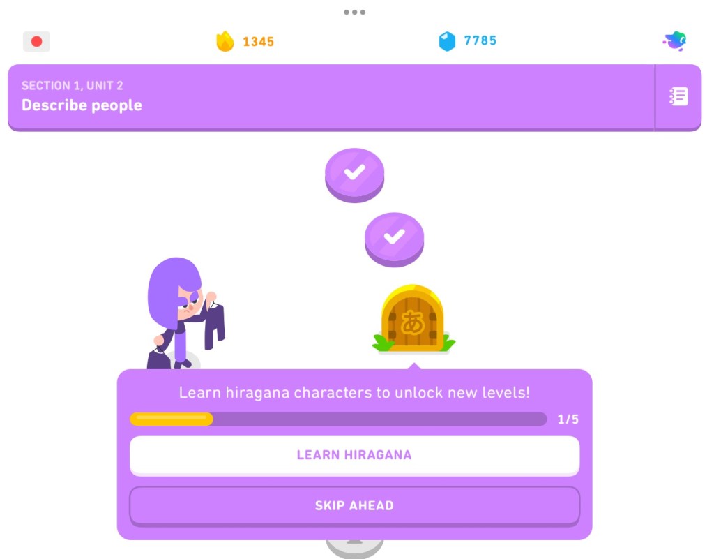 On that note, Duolingo will often slow me down and ask me to complete some writing practice of Hiragana before I’m allowed to complete any more standard lessons. The app will get you to do this throughout the learning process, again and again. As a teacher, I love this use of spaced repetition, since it’s an evidence-based method of learning that’s one of the most effective.