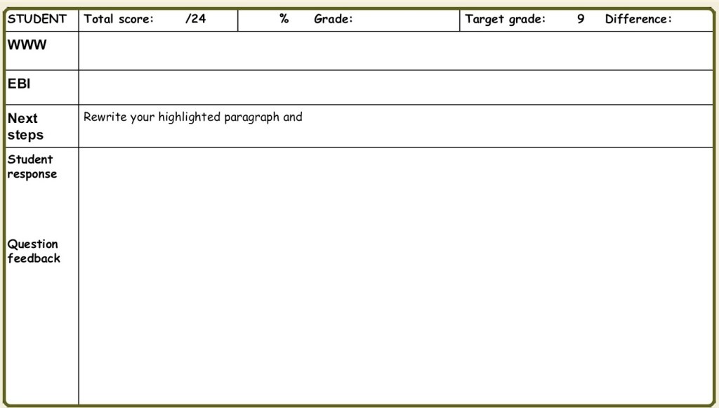 The mark sheet that I use at KS5 is a little different. They have a spot for WWW, EBI and Next Steps, as usual – but I’ve skipped the box for their target grade, since I tend to use these marksheets a lot more frequently for separate essay practice – which is how they’re graded in their exam – rather than for full assessments, which is when they get used during my KS4 feedback. I’d rather they focus more on formative feedback to improve, rather than how far they may have been from their target grade. However, when they complete full assessments or mock exams, they get the full shebang, to keep them on track and aware of their progress.