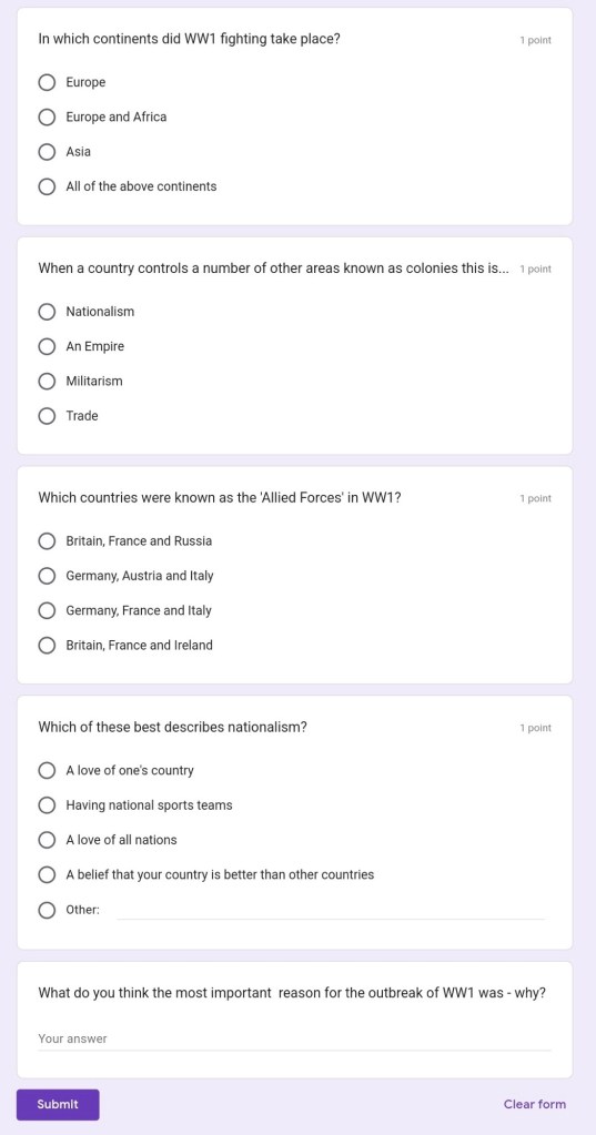 Even better is using these for end-of-unit knowledge tests, since those can sometimes be up to thirty questions long. Don’t get me wrong: these aren’t perfect, since some students could simply guess the correct answer – but they could do these with physical questionnaires too – so why not digitise the format and speed up the process?