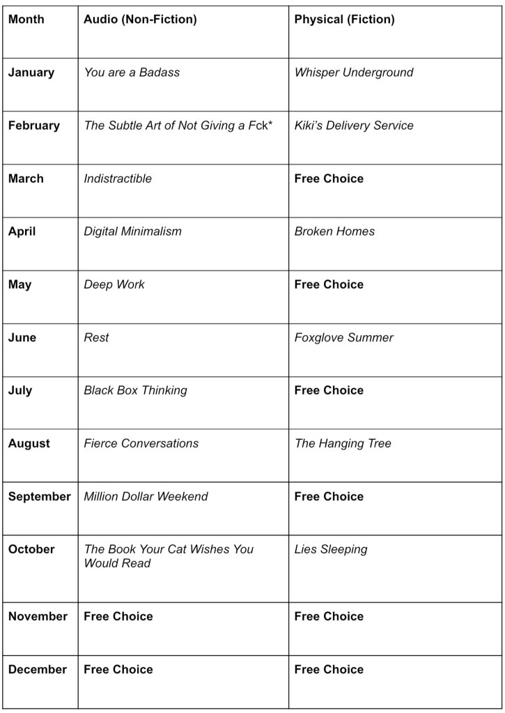 The non-fic will be perfect for your commute or while doing chores, while the physical books should stop you from getting sucked into your phone screen before bed. Here’s your checklist to get them all read each month: