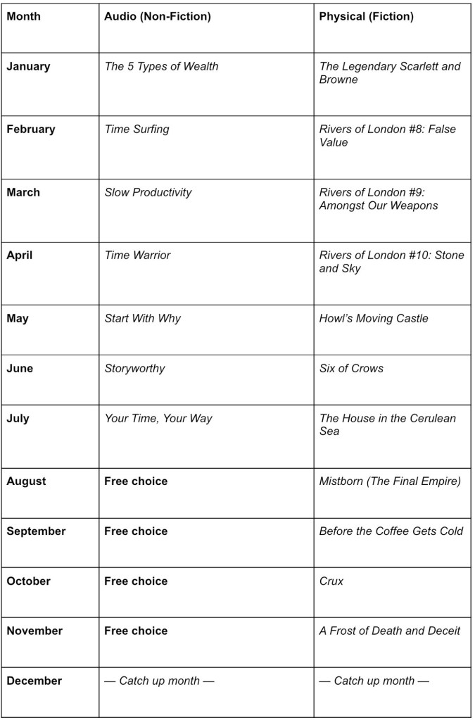 To stay on track with your reading, set yourself a goal (this could be on an app like Goodreads, but it doesn’t have to be), and then consume the non-fiction as audiobooks, and the fiction as physical books.